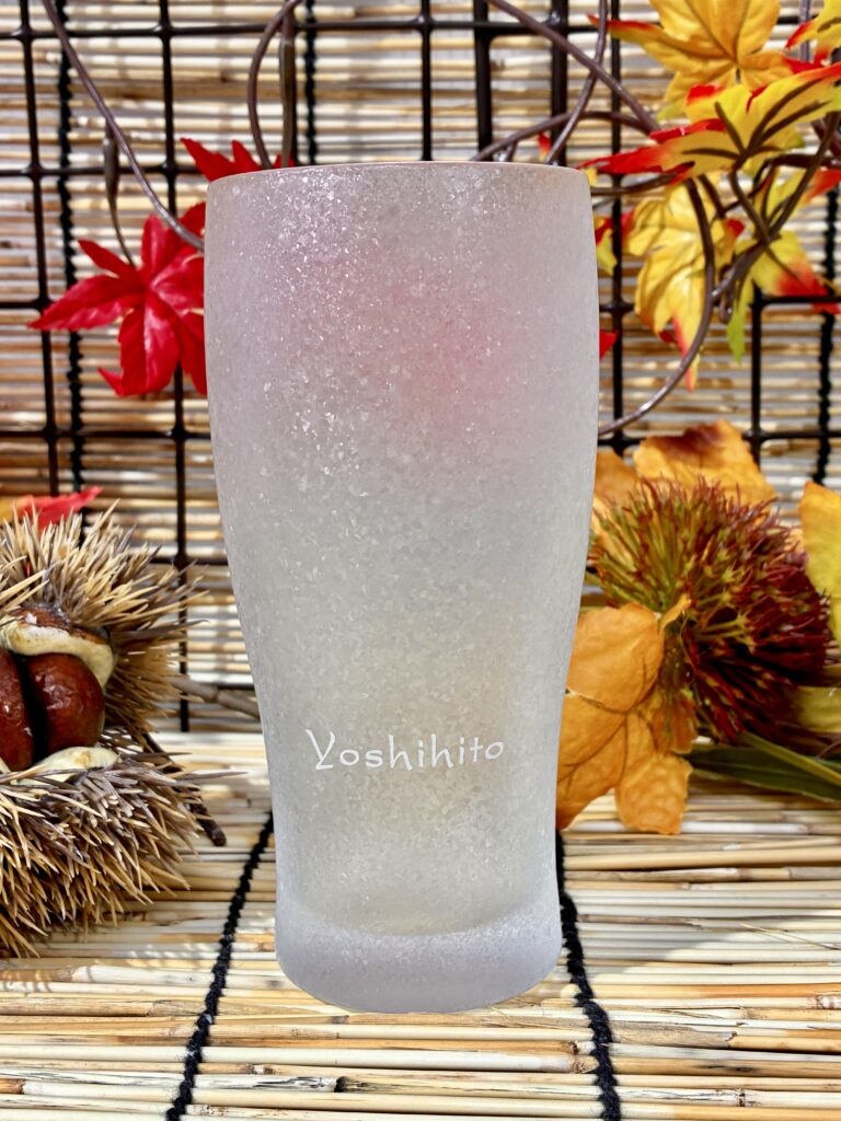 このグラスに シンプルにお名前のみ彫刻をご希望。